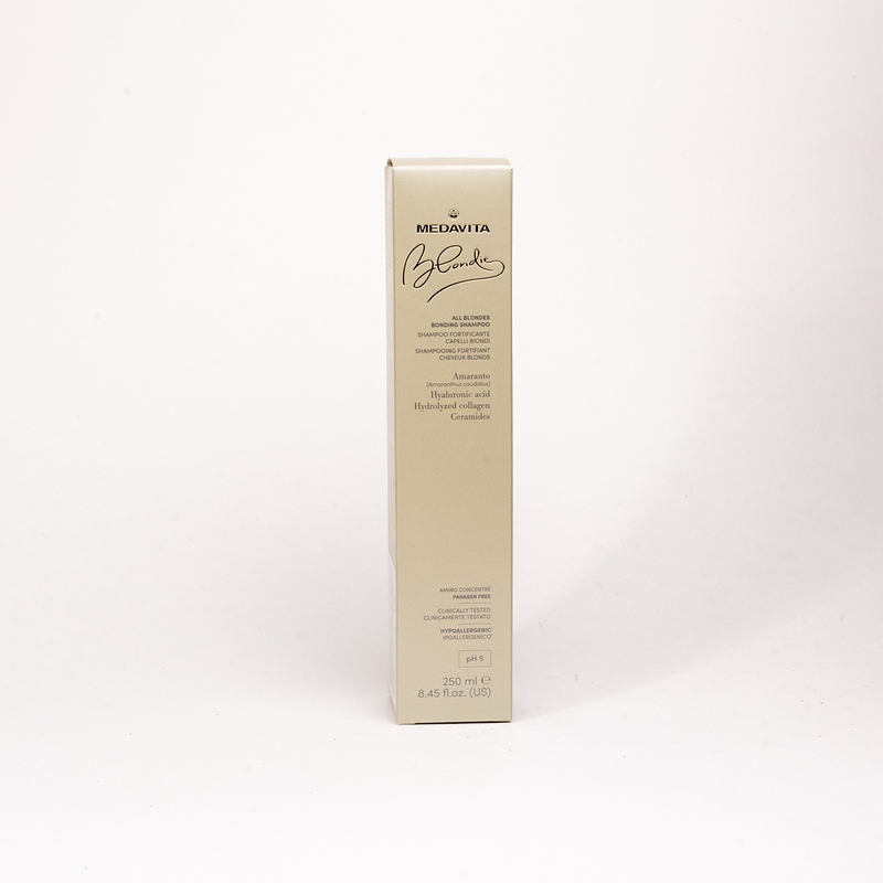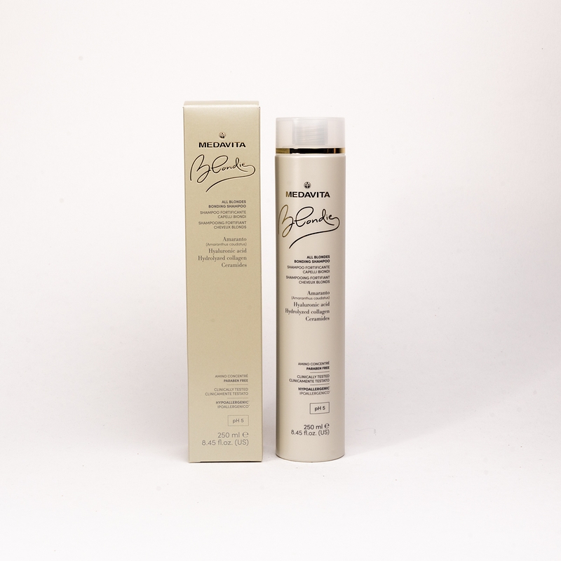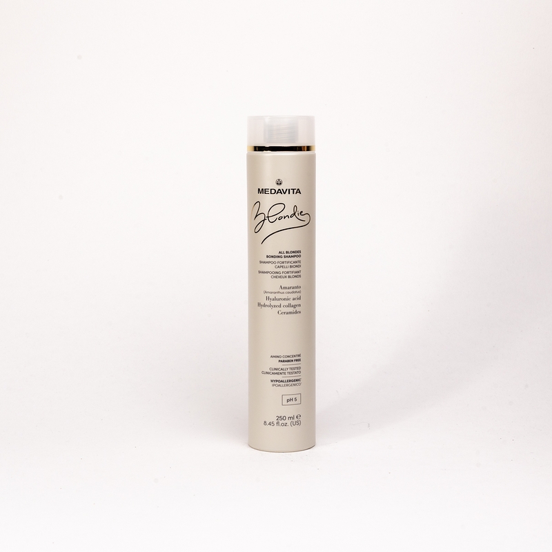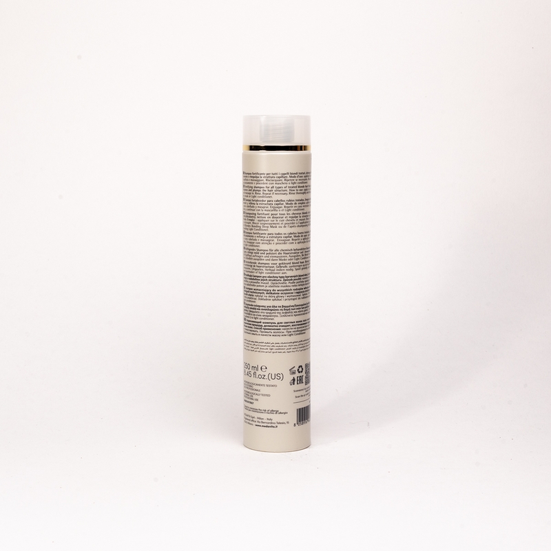 Зміцнювальний шампунь для всіх типів білявого волосся (pH 5) м’яко очищає та зміцнює структуру знебарвленого волосся. Всі активні інгредієнти доповнюють та посилюють дію одне одного, зволожуючи, реструктуруючи волосся та дбаючи про збереження його кольору. Для професійного та домашнього догляду.
