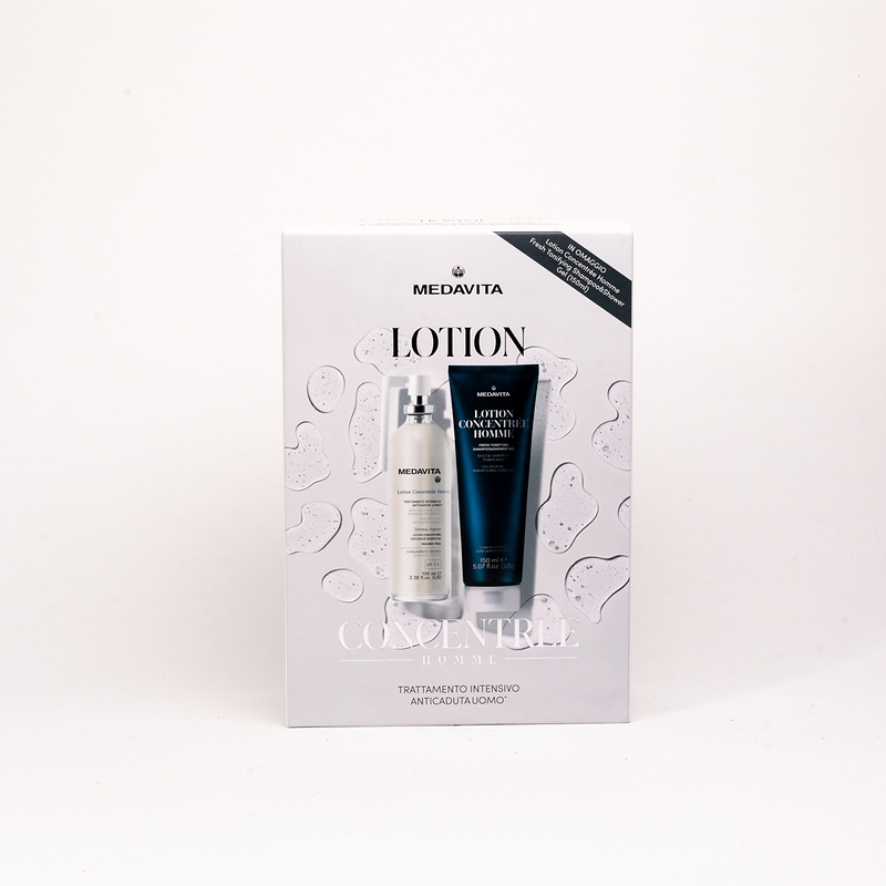 Інтенсивний лосьйон проти випадання волосся у чоловіків (спрей 100 мл) – легендарний лосьйон проти випадання волосся, що на 100% складається з цінних рослинних есенцій з усього світу. Він покращує мікроциркуляцію шкіри голови, живить і зміцнює волосяні фолікули, зміцнює кріплення волосся, протидіє стоншенню волосся та збільшує діаметр стрижнів волосся. Містить екстракт сереної повзучої, що робить його надзвичайно ефективним при андрогенетичній алопеції. Тонізувальний шампунь та гель для душу для чоловіків Lotion Concenrée Homme (150 мл) дбайливо очищує, зволожує та тонізує шкіру голови та тіла. Має у складі екстракти розмарину, сереноа репенс, кориці та інші цінні рослинні екстракти легендарного комплексу Lotion Concenrée Homme, завдяки чому допомагає попередити випадання волосся.