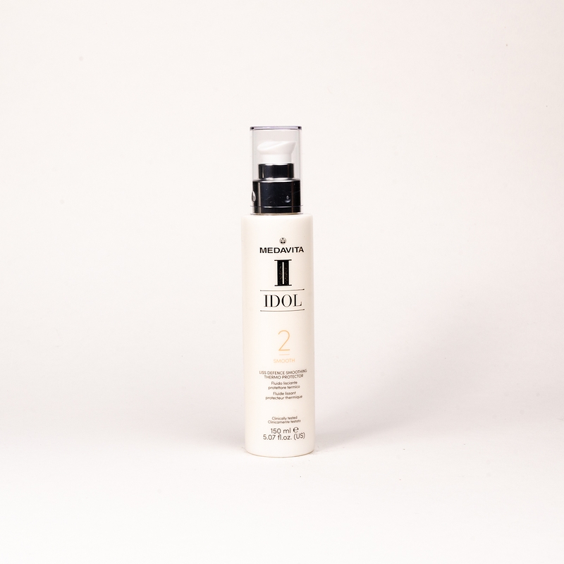 Idol Smooth Liss Defence — легка термозахисна розгладжуюча рідина. Усуває пухнастість, запечатує кутикулу волосся, захищаючи волосяні волокна від надмірного висихання, зневоднення та високих температур під час використання фену, праски для волосся чи під впливом атмосферних чинників. Робить волосся ідеально гладким та надає блиску. Скорочує час висихання волосся. Серце формули — дорогоцінні рослинні олії та масла. Засоби для укладання Medavita Idol містять одні з найдавніших інгредієнтів для догляду за волоссям, відомих людству — 10 дорогоцінних рослинних олій, отриманих за допомогою холодного віджиму насіння і плодів, є безцінним ресурсом для здорового, красивого волосся. Серед них олії бразильського горіха, жожоба, мускусної троянди, солодкого мигдалю та масло мурумуру. Вони живлять та зволожують волосся, надають йому м’якості та еластичності. Спеціальний спосіб виготовлення та обробки цих інгредієнтів дає змогу зберегти їхні корисні властивості, але водночас залишає волосся легким та не залишає жодних слідів чи жирності. Фактор фіксації: 2