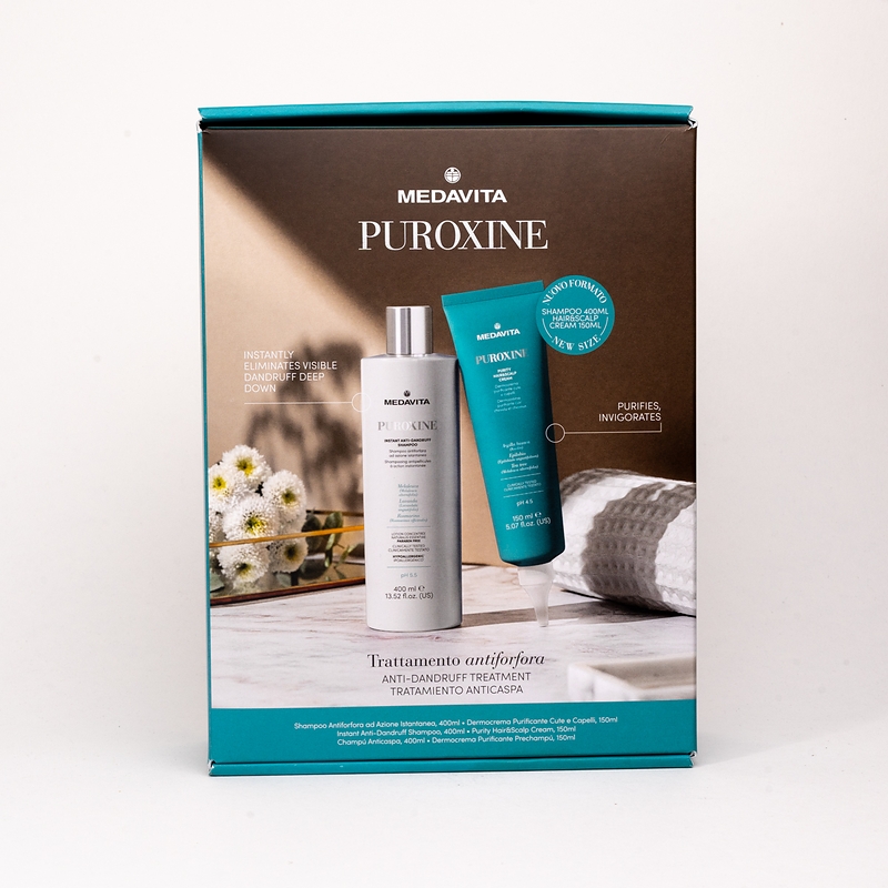 Набір PUROXINE: Шампунь проти лупи миттєвої дії (400 мл) та дермокрем для шкіри голови та волосся "Чистота" (150 мл). Новий ритуал для глибокого очищення та живлення шкіри голови, схильної до появи лупи. Підходить для всіх типів лупи. Дермокрем для шкіри голови та волосся "Чистота" (pH 4.5) використовується перед шампунем. Спеціально створений для догляду за шкірою голови, схильної до появи лупи, а також для усунення всіх видів лупи. Доглядає за довжиною волосся, зволожує та огортає її надтонкою захисною мантією із активних інгредієнтів. Шампунь проти лупи миттєвої дії (pH 5.5). Глибоко очищає, миттєво та повністю усуває лупу, запобігає її повторному утворенню. Усуває свербіж та регулює вироблення шкірного сала. Залишає приємне відчуття свіжості на шкірі голови, а волосся стає м’яким на дотик. Рекомендується в разі будь-якого типу лупи. Ідеально підходить для щоденного використання.